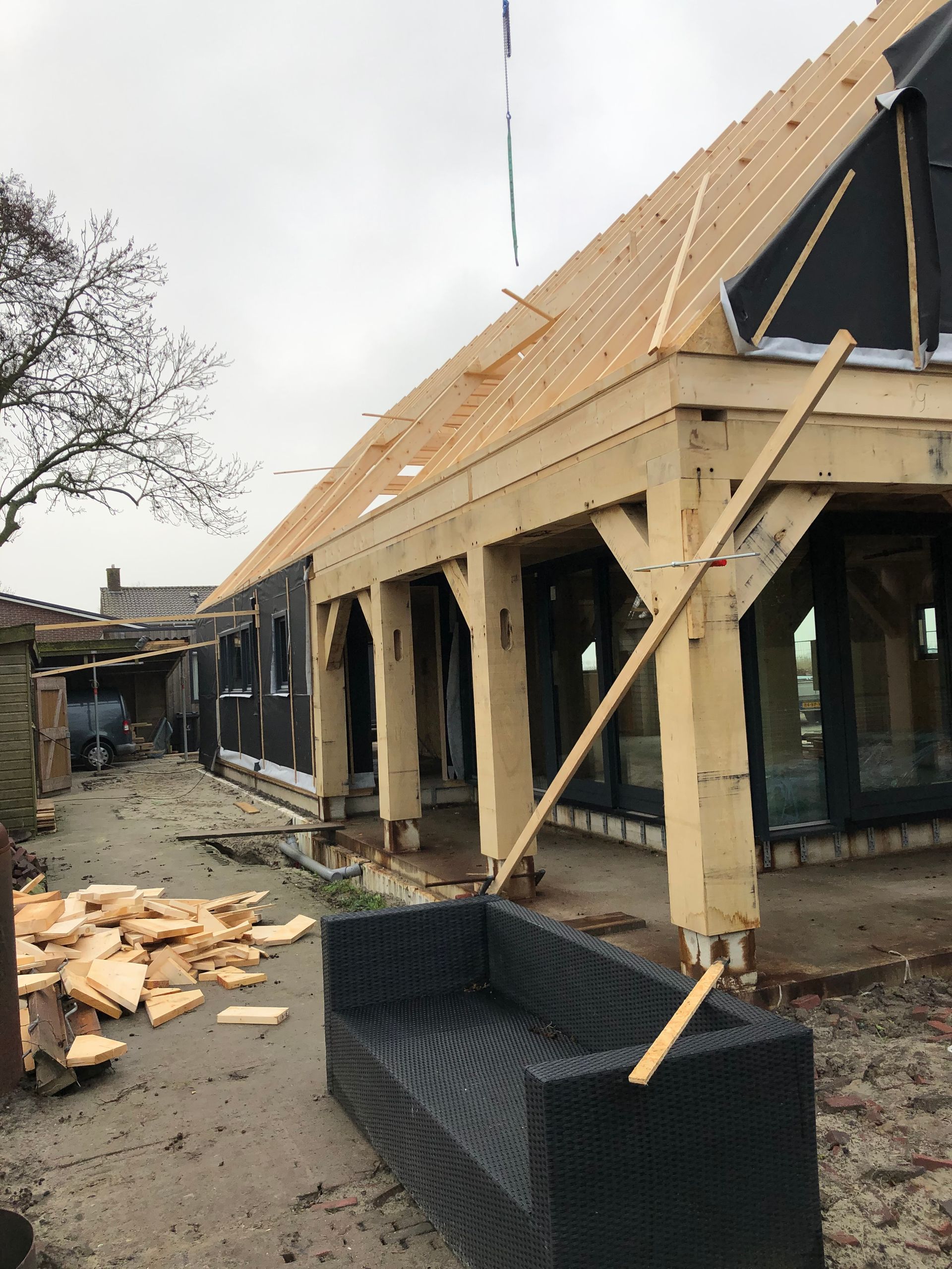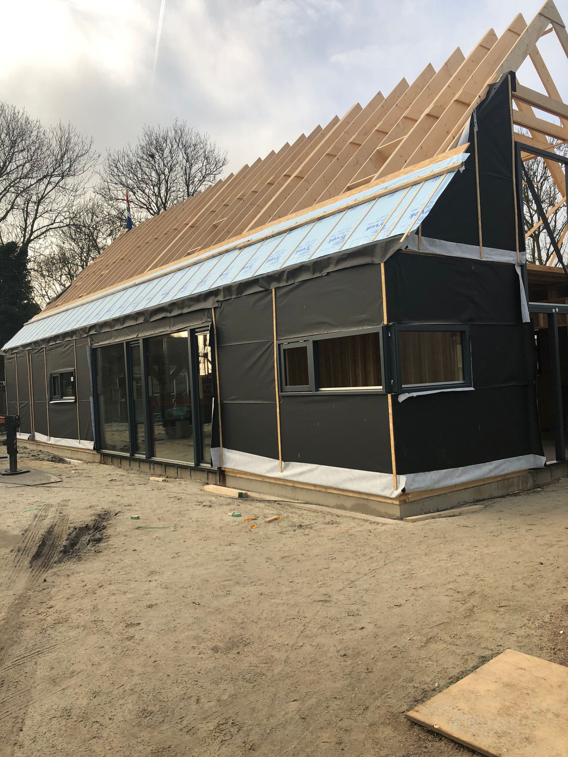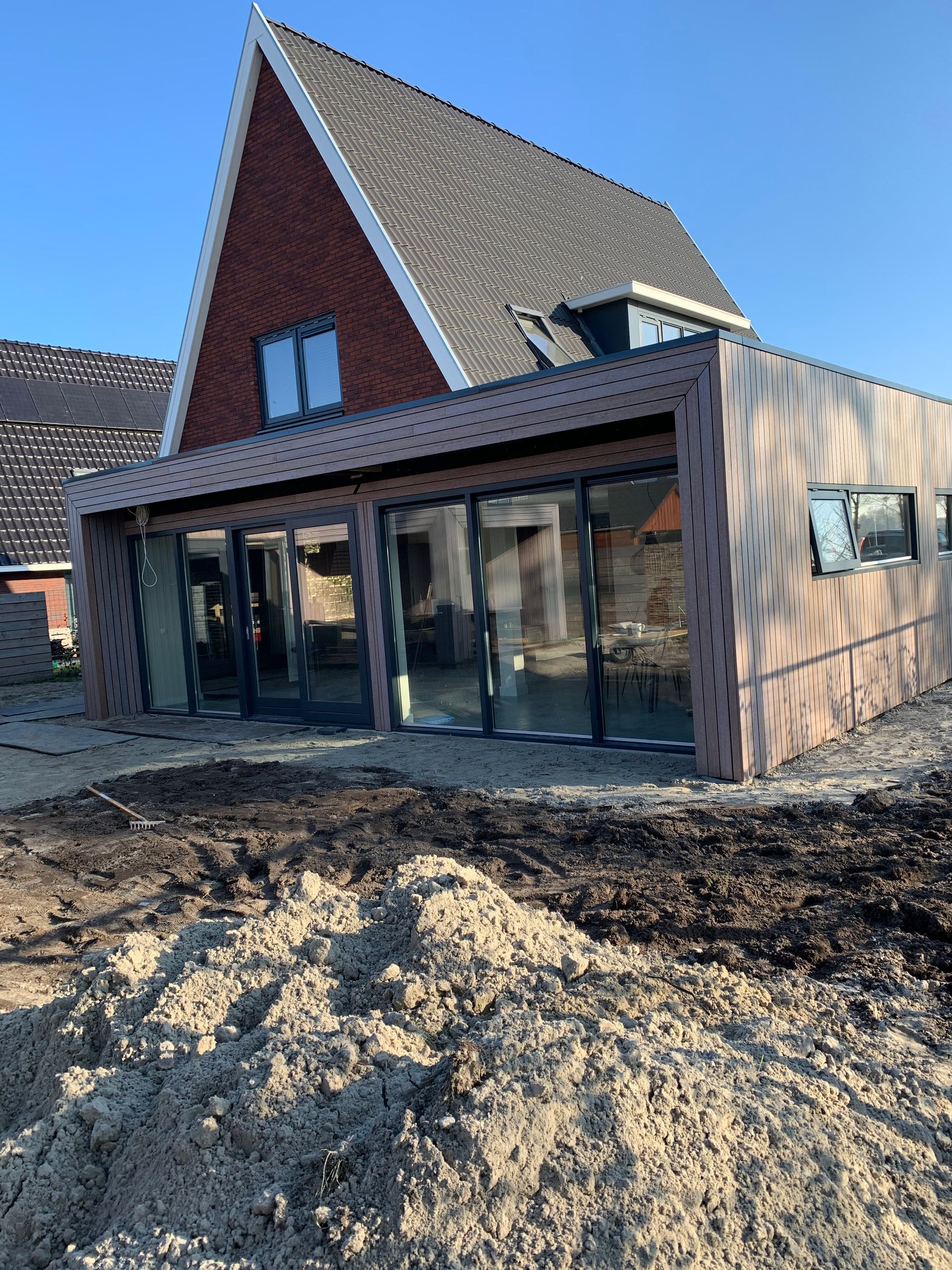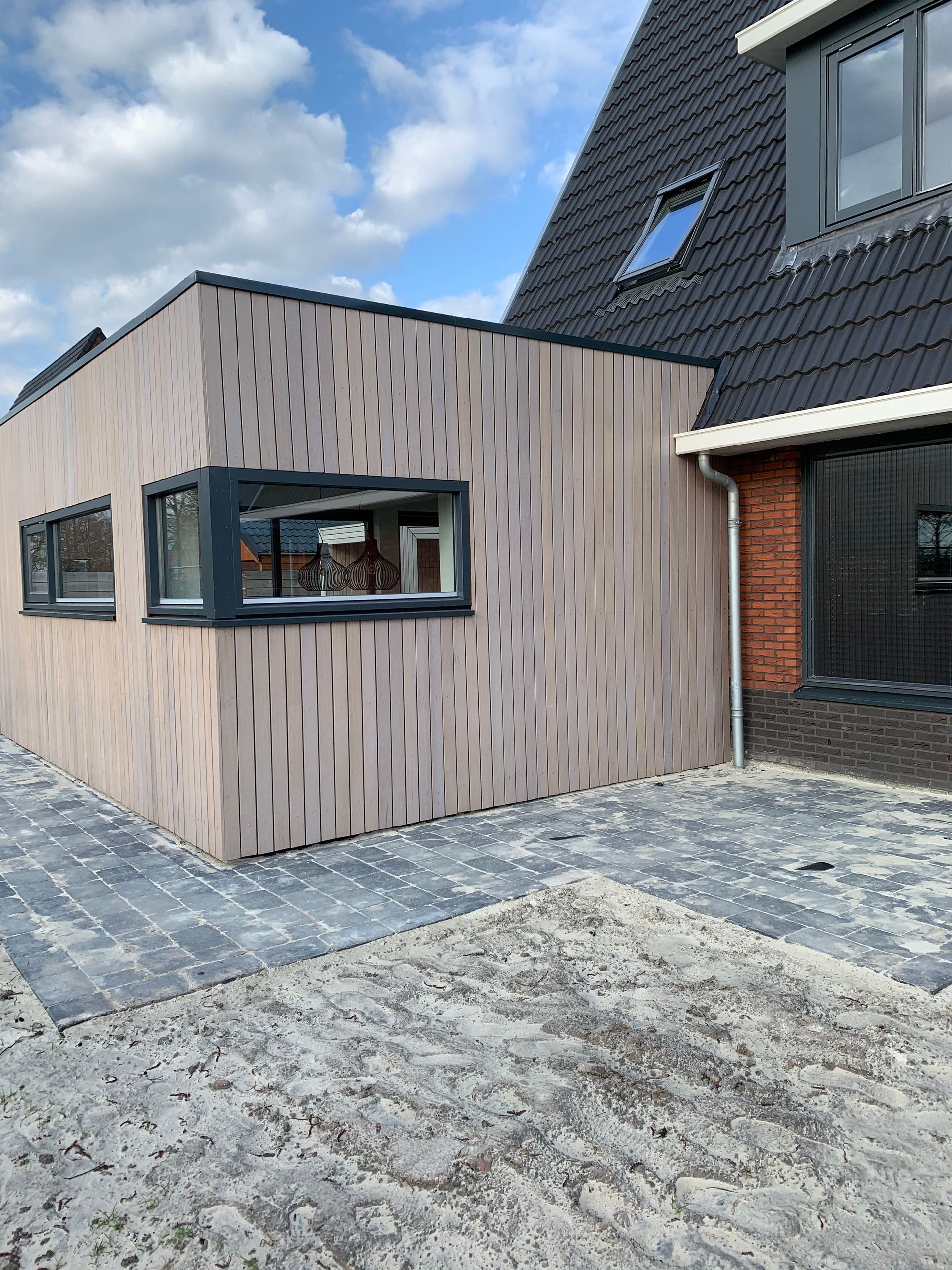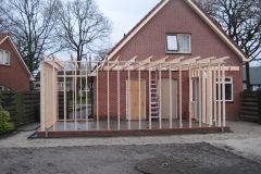 Uitvoering; aanbouw woning, houtskeletbouw.Slaapkamer en douchegelegenheid naar begane grond gebracht in verband met levensbestendig wonen.